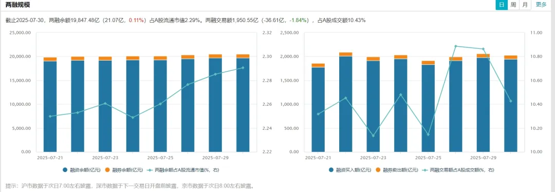 Wind数据显示,融资余额逼近2万亿关口。截至7月30日,两融余额19847.48亿,占A股流通市值2.29%。两融交易额1950.55亿,占A股成交额10.43%。