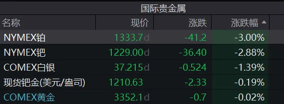 截至14:50,Nymex铂金期货主力最新报1333美元/盎司,日内跌3%。