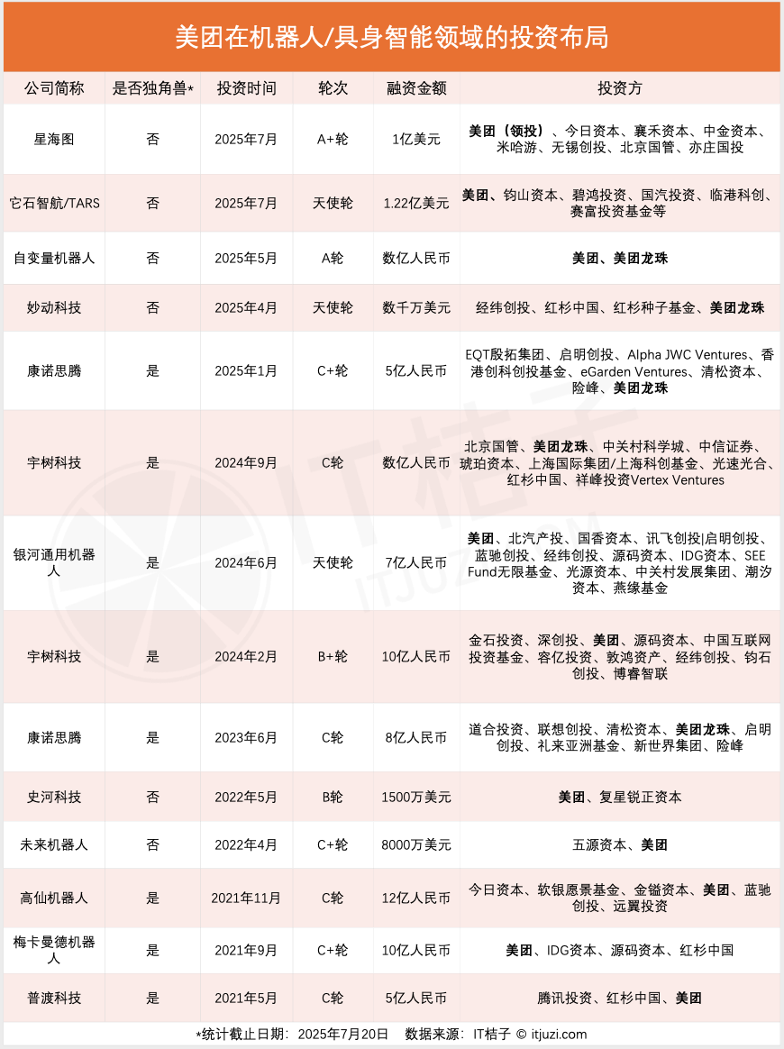 2024年6月至2025年7月,美团在具身智能机器人领域完成7笔投资,包括星海图、它石智航、自变量机器人、妙动科技等,涉及从核心技术研发到场景应用的多个环节,其中2025年的投资尤为密集,展现出对赛道的高度重视。
