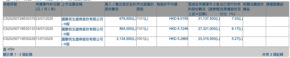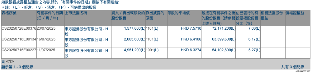 其中,东方证券、中原证券、国联民生 3 家券商的 H 股在 7 月均被买入三次。具体来看, 7 月 23 日,易方达基金买入了东方证券 H 股、国联民生 H 股、中原证券 H 股(中州证券)股份,持有比例均提高至 7.03% 。并且,此前的 7 月 11 日、 7 月 16 日,易方达基金也曾增持过这 3 家券商的 H 股股份。