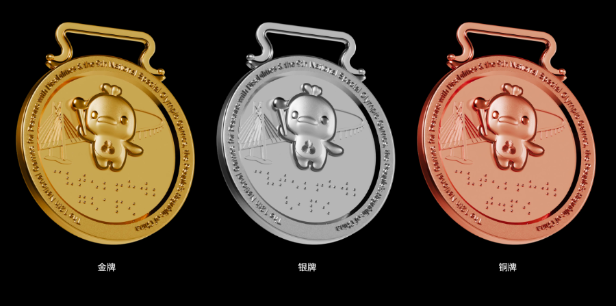 奖牌背面,中华白海豚浮雕,吉祥物高擎火炬,象征奥林匹克精神生生不息、代代相传。浮雕下方创新性地应用了盲文(第一行“残特奥会”,第二行分别为“金牌”“银牌”“铜牌”),体现了对参赛者的用心与尊重,让视障运动员能够亲手触摸这份沉甸甸的荣耀,真切感受属于他们的荣光。此外,背景上的港珠澳大桥是圆梦桥、同心桥、自信桥、复兴桥,体现了逢山开路、遇水架桥的奋斗精神,体现了我国综合国力与自主创新能力,体现了勇创世界一流的民族志气,传递着同心携手、融合发展的图景。