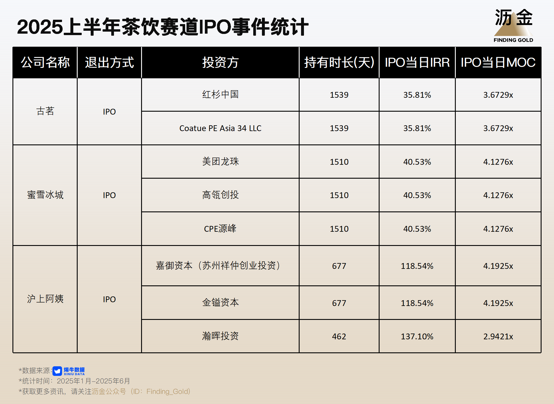 古茗、蜜雪冰城、沪上阿姨顺利实现IPO,这三家品牌的IRR(投资的年化收益率)也十分理想,分别达到了35.8%、40.5%和137.1%。