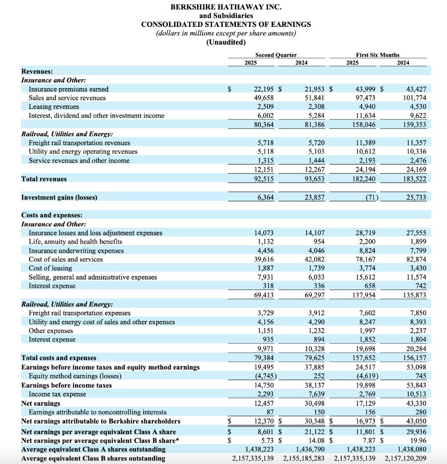 净利润暴跌在很大程度上受到投资组合估值变化的拖累。二季度伯克希尔投资净收益49.7亿美元,上年同期为187.5亿美元。巴菲特曾多次吐槽,投资和衍生品的收益和损失对于理解财报和评估经济表现并没有真正意义,会对投资者造成极大误导。