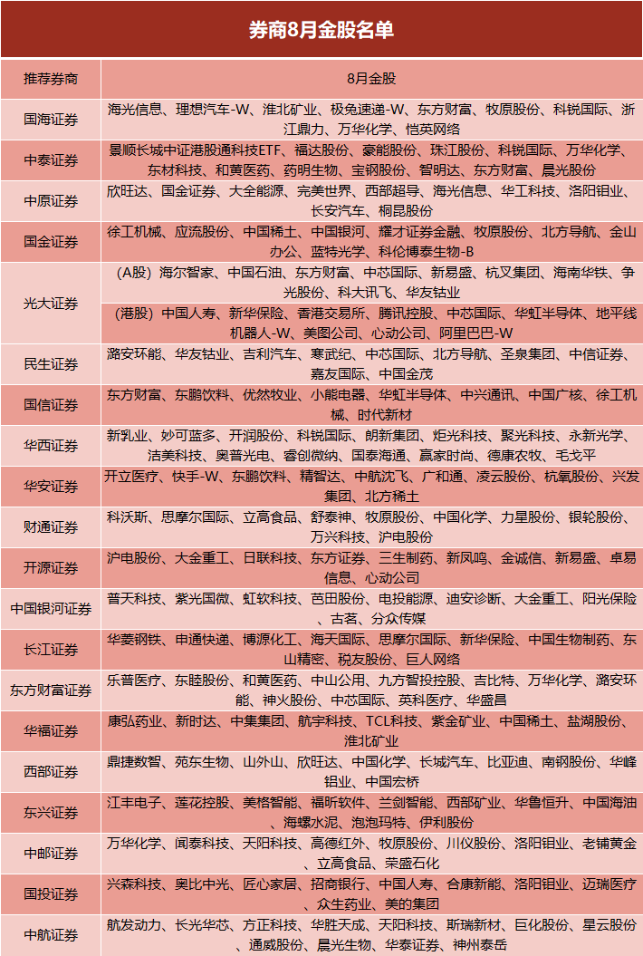 进入8月,券商最新一期金股名单陆续出炉,电子、基础化工、医药生物、机械设备等行业金股数量占比靠前。机构普遍看好市场冲击新高,东方财富、洛阳钼业成为本月机构关注度最高的金股。