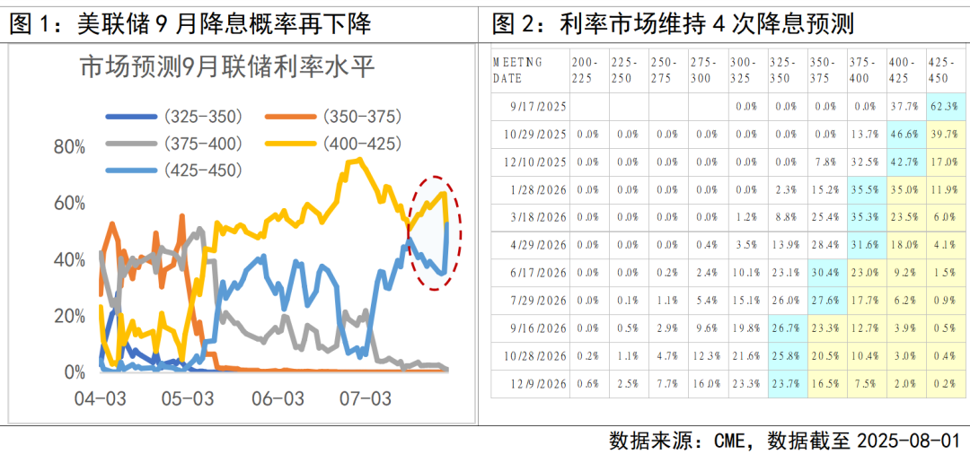 美联储主席鲍威尔在记者发布会上略显鹰派的发言,使得市场降低9月降息预期。鲍威尔表示,当前通胀仍高于政策目标,关税成本转嫁消费者状况仍有待观察,上半年美国经济增长有所下滑但就业市场依然平衡,联储没有预先的降息路径,利率市场对9月美联储降息预期随即降至40%以下。然而,鲍威尔对关税的通胀影响“是一次性的合理基准”的判断仍为降息铺路,他表明通胀结构中服务通胀有所降温,若关税政策的通胀影响表现为短暂性因素,则降息路径会更加明朗。