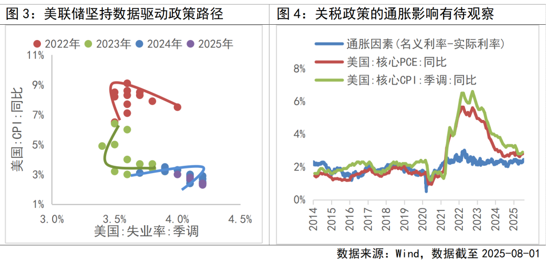 美国6月核心PCE同比上涨2.8%,高于市场预期的2.7%,持续高于美联储2%的政策目标,形成“顽固性差距”。更值得关注的是,通胀压力源于关税政策的部分仍未完全显现,鲍威尔表示,“关税开始在消费者价格中体现,预计通胀数据将受到更多关税影响”、“核心通胀环比上涨中有30%或40%来自关税”,他认为当前无法将关税对通胀的影响单独剥离出来,目前观察到的关税成本传导中,企业承担了大部分,这种"成本吸收"模式难以持续,关税负担预计部分由企业部门向居民部门转移,形成新的通胀压力。特朗普政府关税政策成为本轮降息路径中重要的不确定性,未来1~2个月,关税影响是否反映在通胀指标上是核心博弈点。
