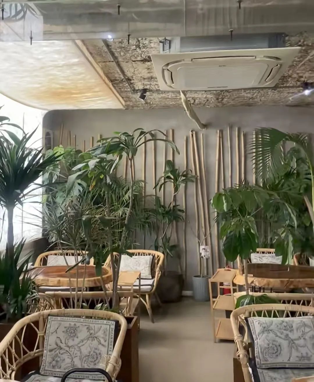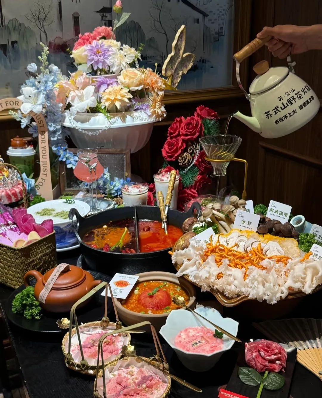 部分网红茶火锅门店干脆直接将“茶火锅+山野火锅”餐饮行业当前流行的两种风格去做融合。比如苏州的苏见山除了满满一面茶墙等典型茶馆元素外,店内还会布置众多绿植,餐桌上还摆满色彩缤纷的鲜花,增加“在山野间品茶涮火锅”的氛围感。