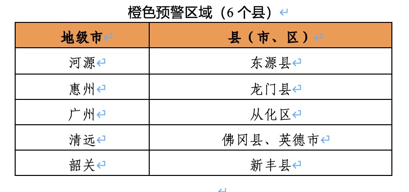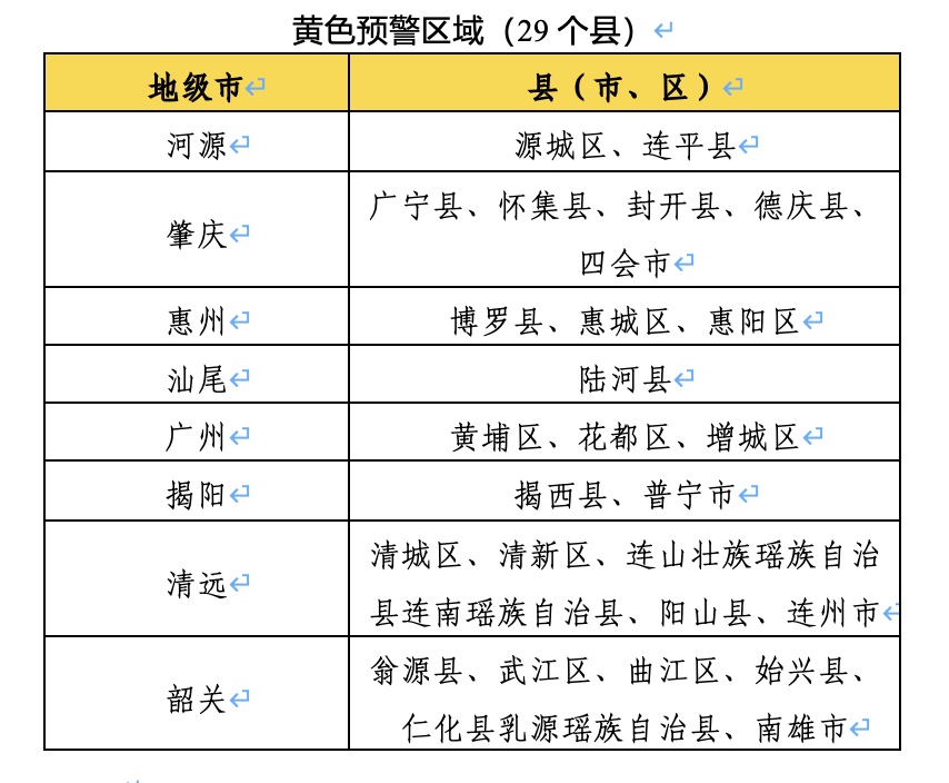 同时,全省还有29个县(区)局地发生山洪灾害可能性较大(黄色预警)。其中包括,河源源城区、连平县,肇庆广宁县、怀集县、封开县、德庆县、四会市,惠州博罗县、惠城区、惠阳区,汕尾陆河县。以及,广州黄埔区、花都区、增城区,揭阳揭西县、普宁市,清远清城区、清新区、连山壮族瑶族自治县、连南瑶族自治县、阳山县、连州市,韶关翁源县、武江区、曲江区、始兴县、仁化县、乳源瑶族自治县、南雄市。