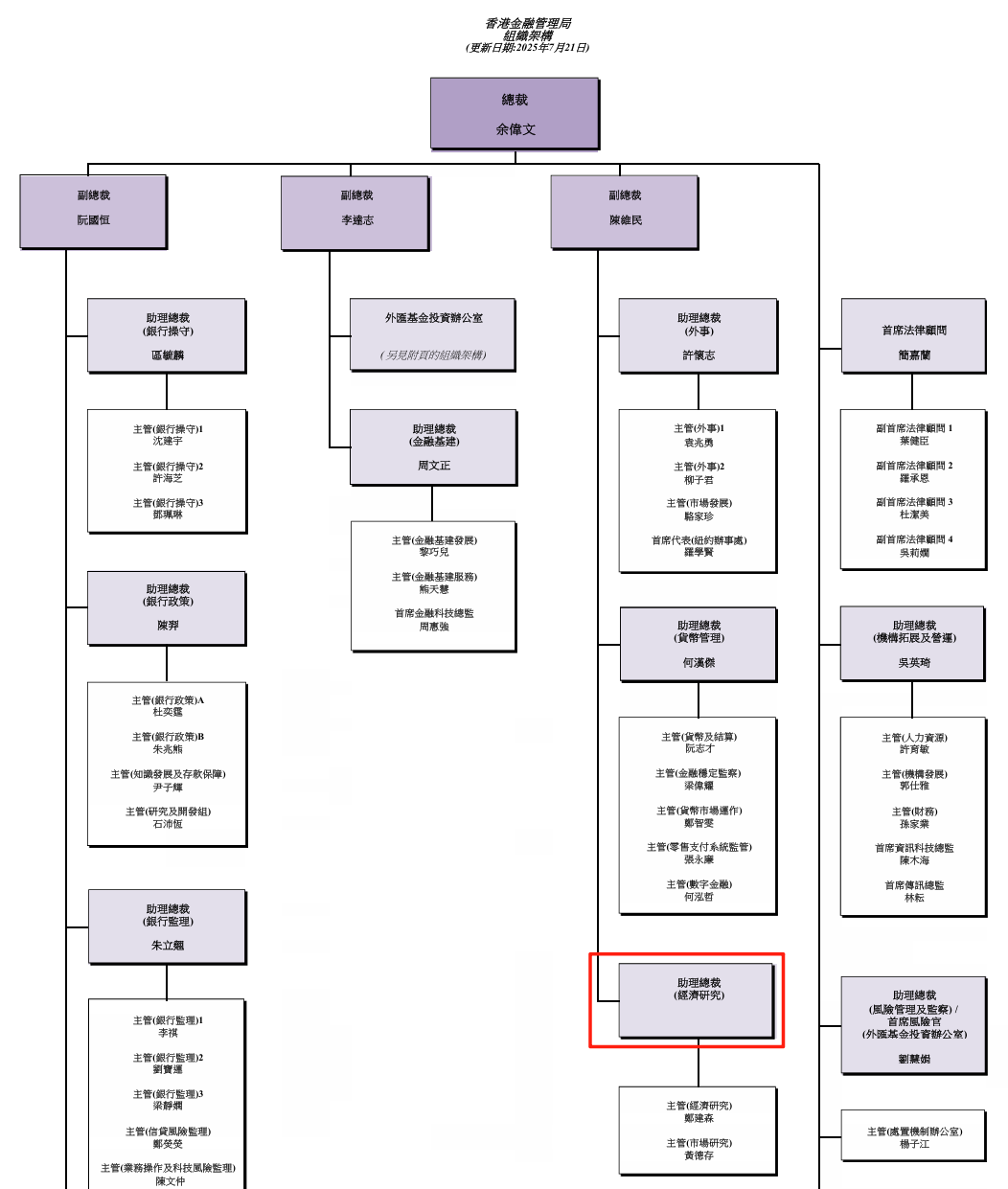 根据香港金管局最新发布的组织架构文件,助理总裁(经济研究)一职目前空缺,其上级为副总裁陈维民,下设主管(经济研究)、主管(市场研究)岗位。