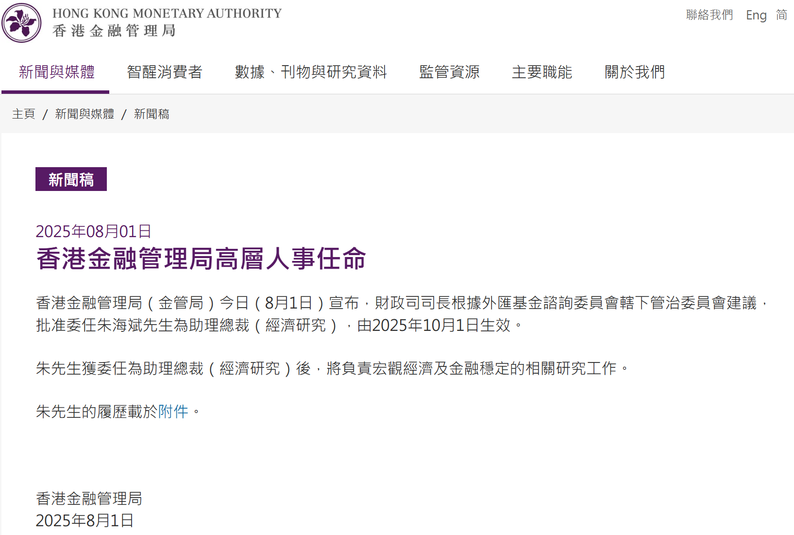 图/香港金管局宣布批准委任朱海斌为助理总裁(经济研究)