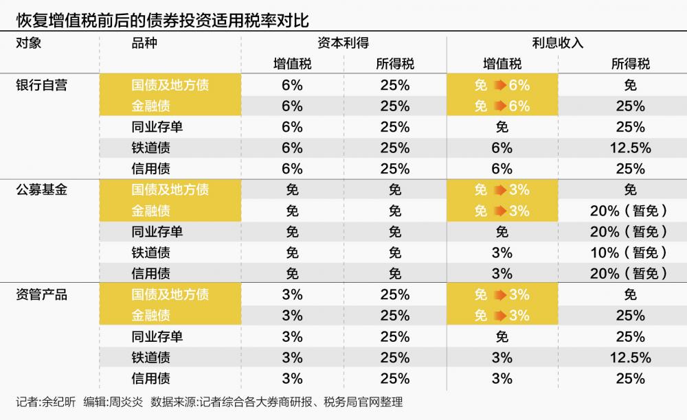 国债、地方债和金融债是银行和资管机构的重要持仓品种,此次政策调整不可避免将影响其税后的债市收益。中金公司研究部分析师东旭指出,针对8月8日起的新发债券,银行等机构自营投资将适用于6%的税率,资管类产品适用于3%的税率。