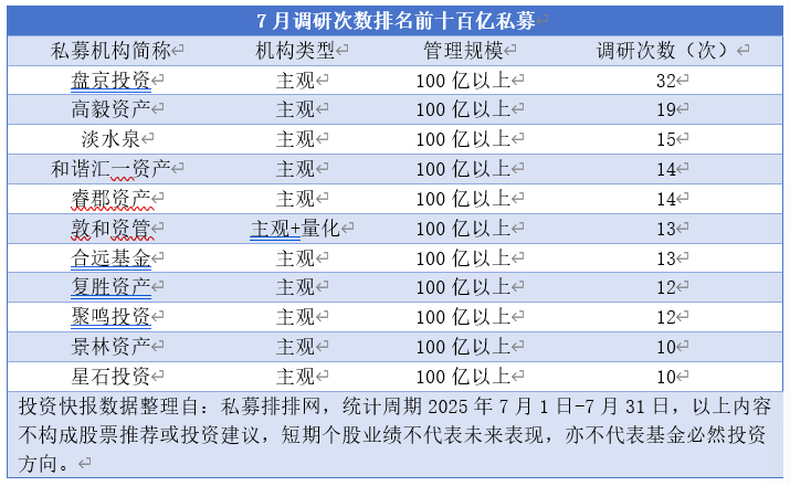 36家百亿私募7月合计调研达236次,前十名调研次数均不少于10次,除盘京投资和高毅资产外,还包括淡水泉、和谐汇一资产、睿郡资产、敦和资管、合远基金、复胜资产、聚鸣投资、景林资产和星石投资,其中敦和资管是唯一一家调研次数排名前十的主观+量化的混合型私募,其余均为主观私募。
