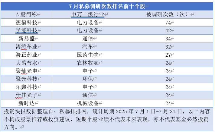 前十个股均被调研不少于24次,电力设备行业个股德福科技被调研74次居首,大幅领先于其余个股,该股7月吸引到聚鸣投资、睿郡资产、双安资产、复胜资产等一众百亿私募扎堆调研。紧随其后的是另一只电力设备个股孚能科技,该股获得永安国富、正圆投资在内的私募机构合计调研达42次,可见私募机构对电力设备行业个股的青睐。