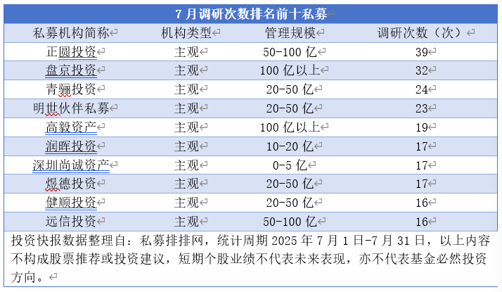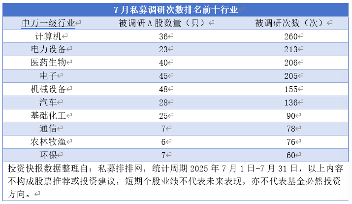 投资快报记者从私募排排网统计数据看到,截至2025年7月31日,7月共有657家私募证券管理人参与到A股调研活动中,调研范围覆盖到28个申万一级行业中的358只个股,合计调研次数达1763次。