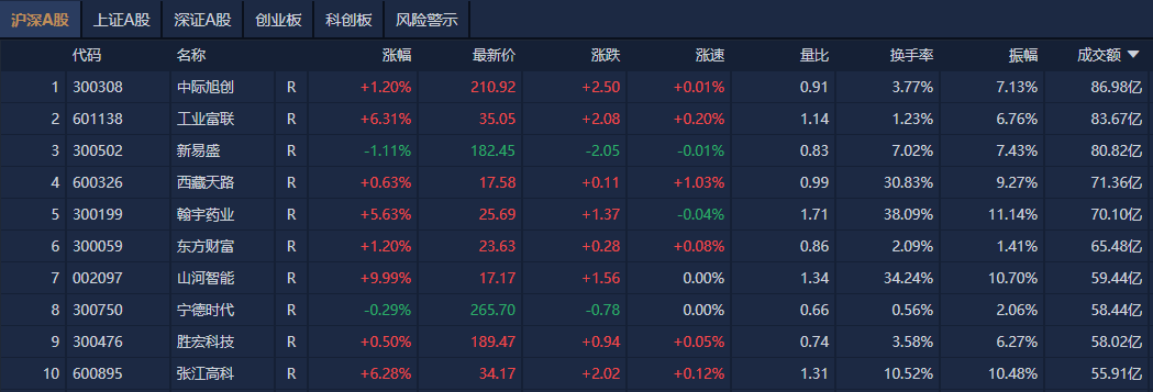 沪深两市全天成交额1.6万亿元,较上个交易日放量975亿。个股方面,中际旭创成交额超86亿元居首,工业富联、新易盛、西藏天路成交额靠前。
