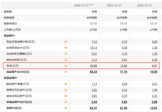 这种矛盾的背后,是企业战略选择的痕迹。2024年,老铺黄金的存货规模突破40亿元,超过2023年的3倍、2022年的5倍。在黄金牛市的背景下,这种大规模囤货行为,或许是企业为对冲金价上涨带来的成本压力而采取的未雨绸缪之举,但也无疑加剧了资金周转的压力。