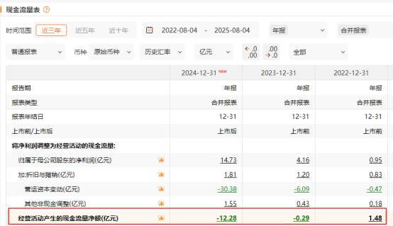 事实上,翻开其现金流量表,2024年,老铺黄金经营现金流其实出现了12.28亿元的大额净流出,且2023年也未实现净流入。