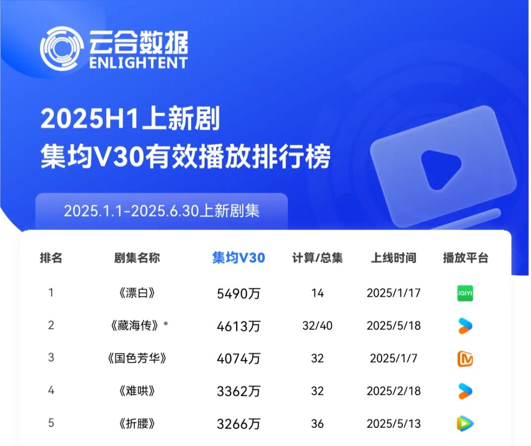 在云合日前发布的2025H1长剧报告中,《大奉打更人》《藏海传》《国色芳华》拿下正片有效播放TOP3,但榜首的19.3亿在2024年只能排在第五位。《漂白》以热播期集均、集均V30双破5000万位居榜首,在2024年同样只能排在第六名。——大盘趋冷,是今年最现实的议题。