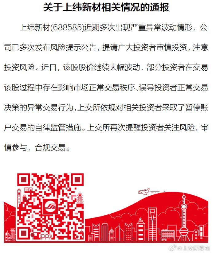 上纬新材(688585)近期多次出现严重异常波动情形,公司已多次发布风险提示公告,提请广大投资者审慎投资,注意投资风险。近日,该股股价继续大幅波动,部分投资者在交易该股过程中存在影响市场正常交易秩序、误导投资者正常交易决策的异常交易行为,上交所依规对相关投资者采取了暂停账户交易的自律监管措施。上交所再次提醒投资者关注风险,审慎参与,合规交易。