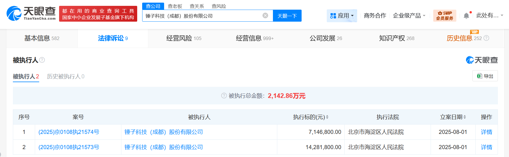 8月5日消息,天眼查App显示,近日,锤子科技(成都)股份有限公司新增2条被执行人信息,执行标的合计2142万余元,执行法院为北京市海淀区人民法院。