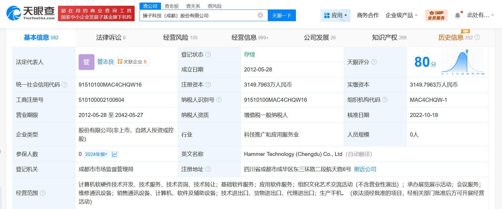 锤子科技(成都)股份有限公司成立于2012年5月,法定代表人为管志良,注册资本约3149.8万人民币,经营范围含基础软件服务、应用软件服务、组织文化艺术交流活动、承办展览展示活动等。
