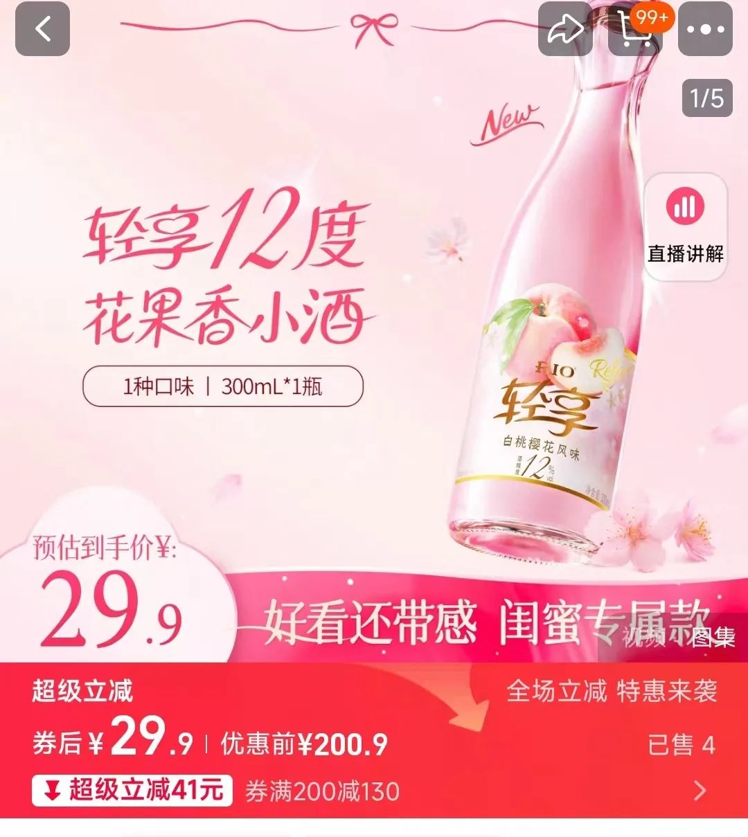 截至8月5日当晚,该产品线上销售数据没有出现大量增长。以天猫旗舰店为例,三款不同包装的12度花果香小酒中,29.9元的1瓶装、129元的6瓶装分别显示售出4件、2件,229元的12瓶装则显示“已售0”。
