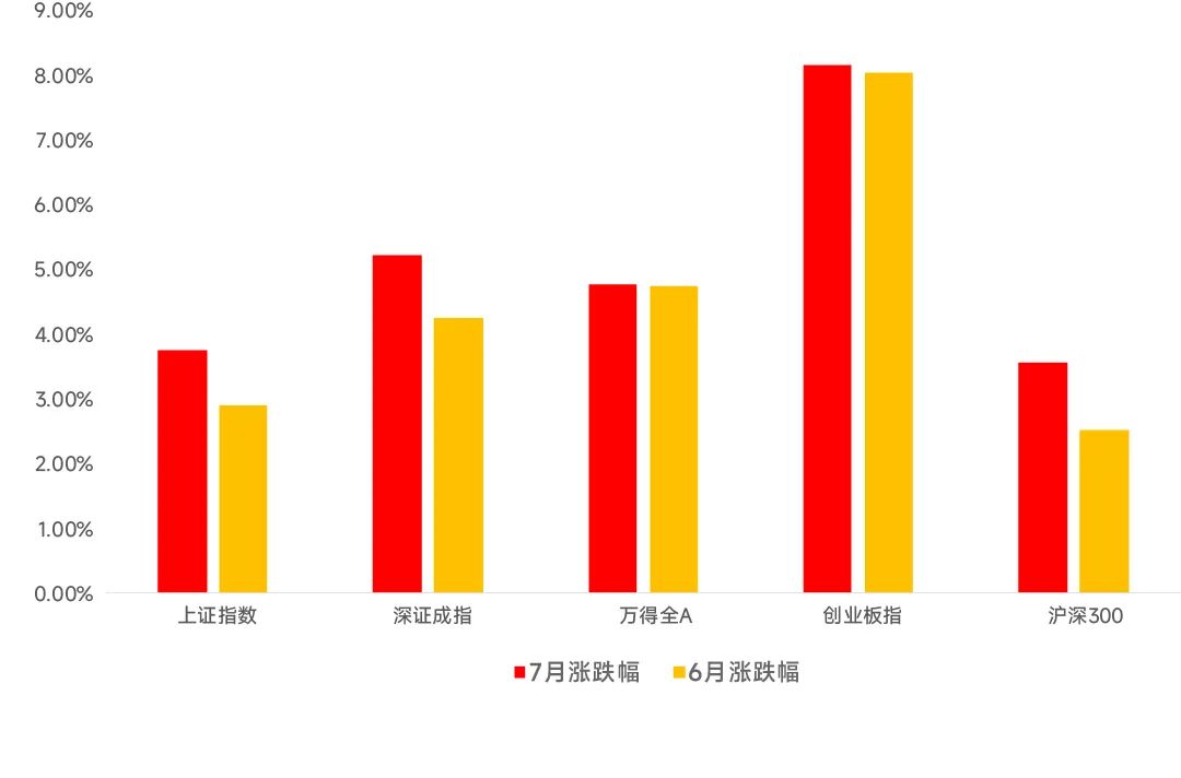 刚刚过去的7月,A股延续上个月的上涨趋势,沪指、深成指、创业板指、沪深300等重要指数涨幅均超过6月,继续回暖。