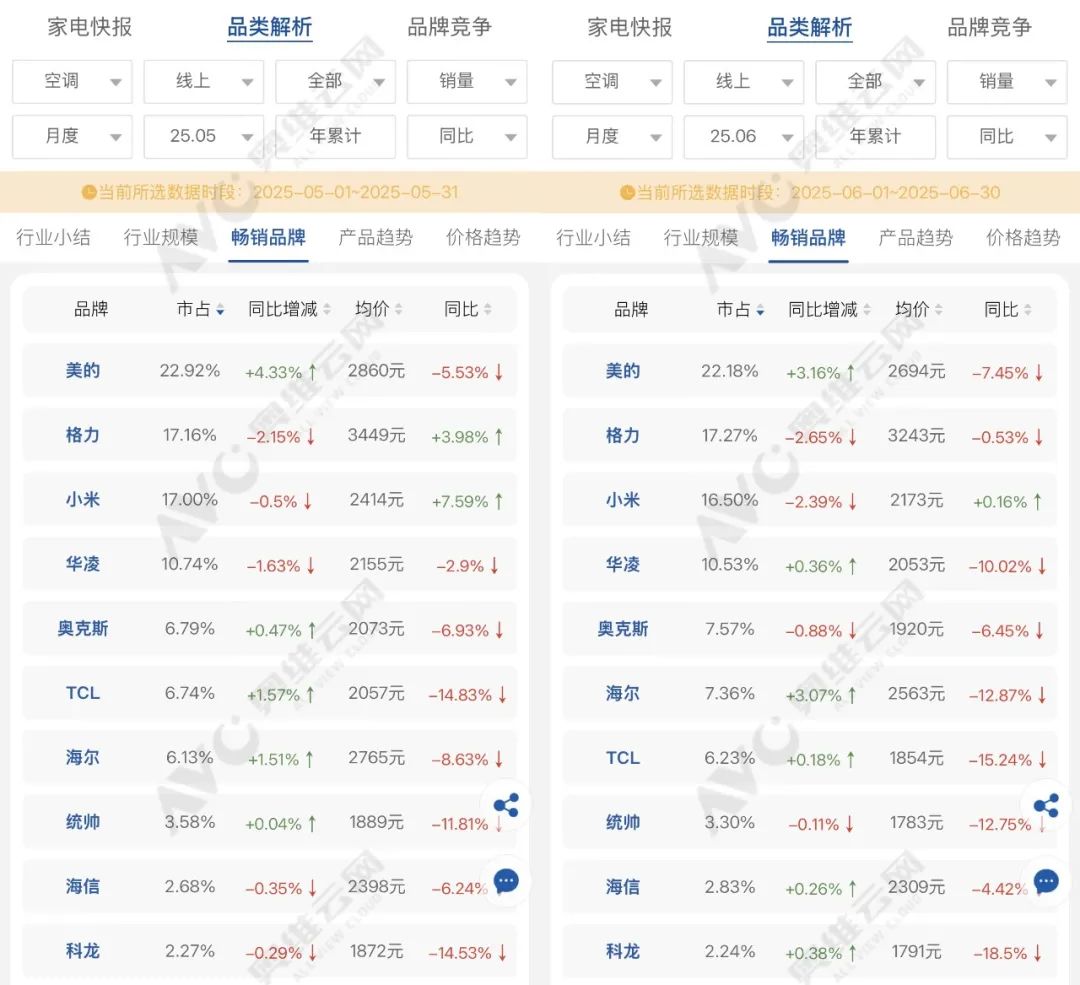 | 2025年5、6月线上空调销量情况及均价。数据来源:奥维云网