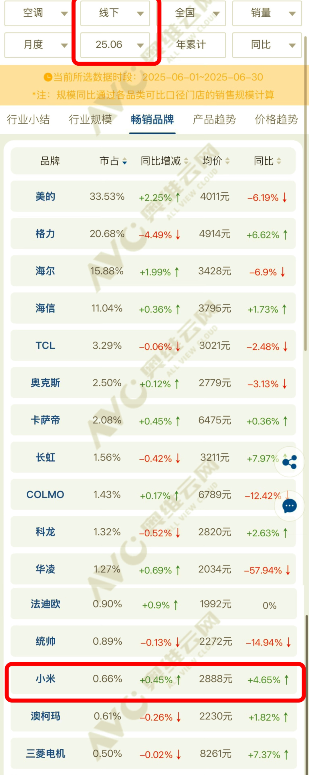 | 截至2025年6月,最新的小米线下销量份额为0.66%。数据来源:奥维云网