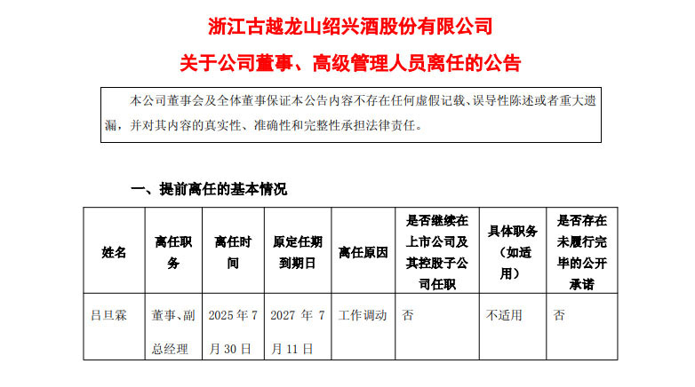 7月31日,古越龙山公告,吕旦霖提前离任公司董事、副总经理职务,理由为“工作调动”,其原定任期至2027年7月。