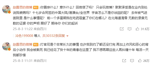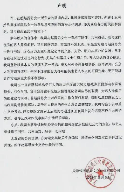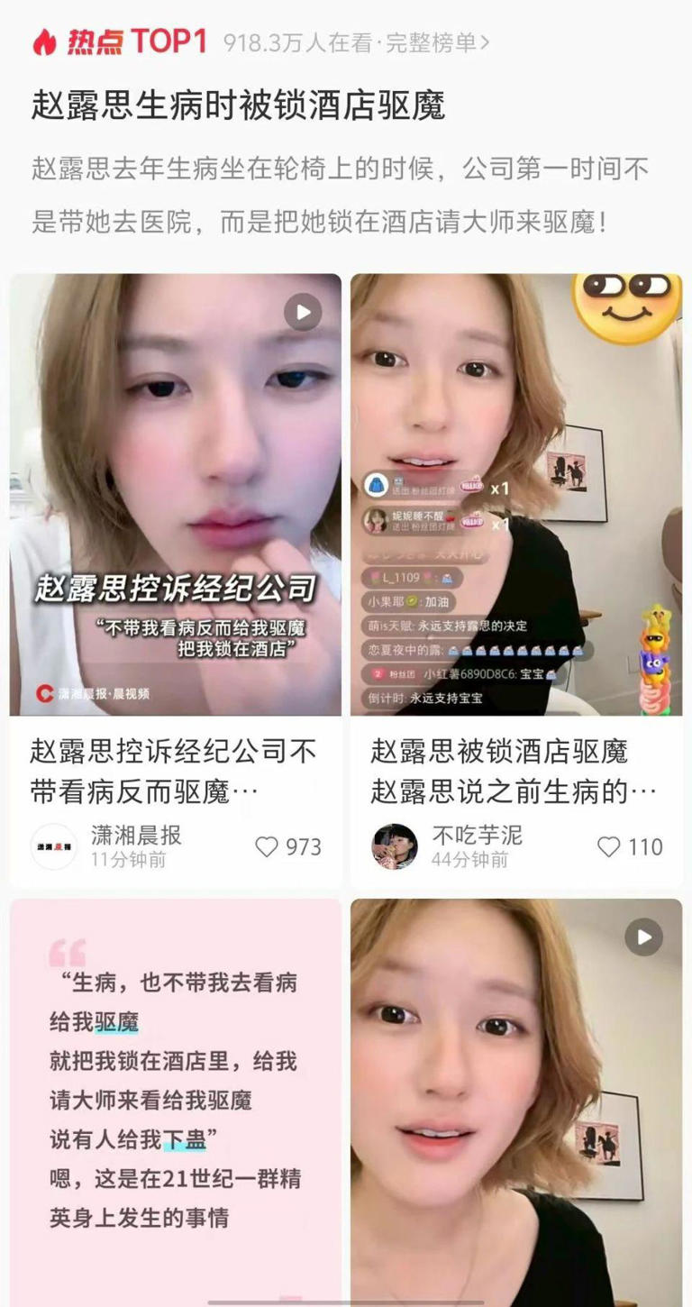8月3日,“银河酷娱取关赵露思”冲到热搜第一。赵露思转发银河酷娱传媒的声明,并配“绿茶”表情发出“八问”。此后,赵露思在抖音开启了个人直播,直播标题配文“没疯,谢谢”,后在小红书直播,直播中透露的想开面馆、甜品店闭店、被经纪公司关酒店驱魔等相关事件,均登上热搜。