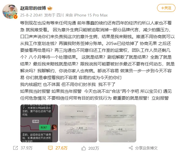 7月8日,网友发现赵露思社交平台主页的“银河酷娱MCN”认证标识消失。上周六晚八点半,赵露思选择手撕自己的经纪公司银河酷娱,控诉公司“多宗罪”,未经协商划走工作室账户205万元赔偿代言损失、诱导签署分账单、工作室运营权归属、解约无果等。这新的一集堪称是年初生病停工、争议满天飞的个人定制综艺《小小的勇气》之后,顺理成章的续集。