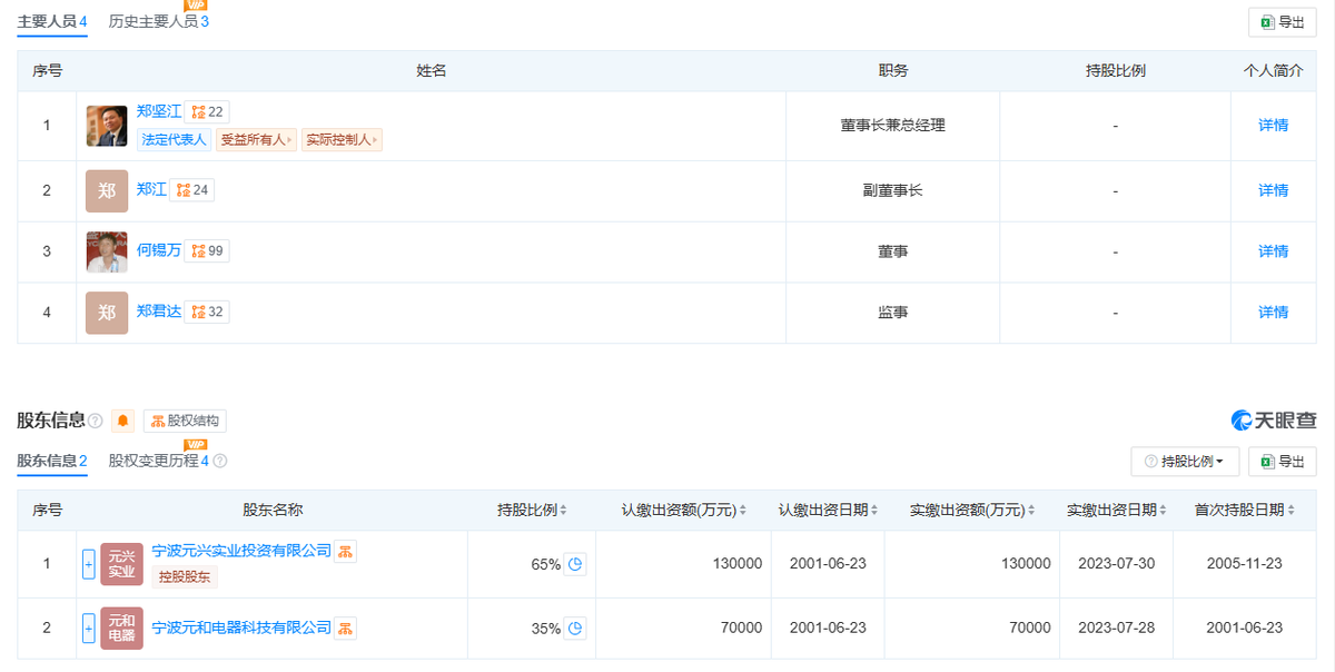 奥克斯具有明显的家族企业的特点。天眼查显示,奥克斯有两大股东,宁波元兴实业投资有限公司和宁波元和电器科技有限公司。这两家公司的股东均为奥克斯创始人郑坚江、郑坚江弟弟郑江、郑坚江妻弟何锡万,三人在两家公司的持股比例均为85%、10%、5%。招股书显示,三人通过间接的方式共持有公司96.36%的股份。