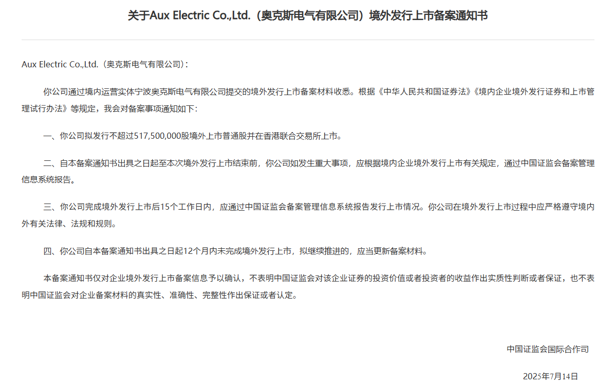 7月16日,奥克斯再次向港交所递交了申请书。7月17日,证监局发布了《关于Aux Electric Co.,Ltd.(奥克斯电气有限公司)境外发行上市备案通知书》,这意味着,奥克斯已完成港股上市备案。