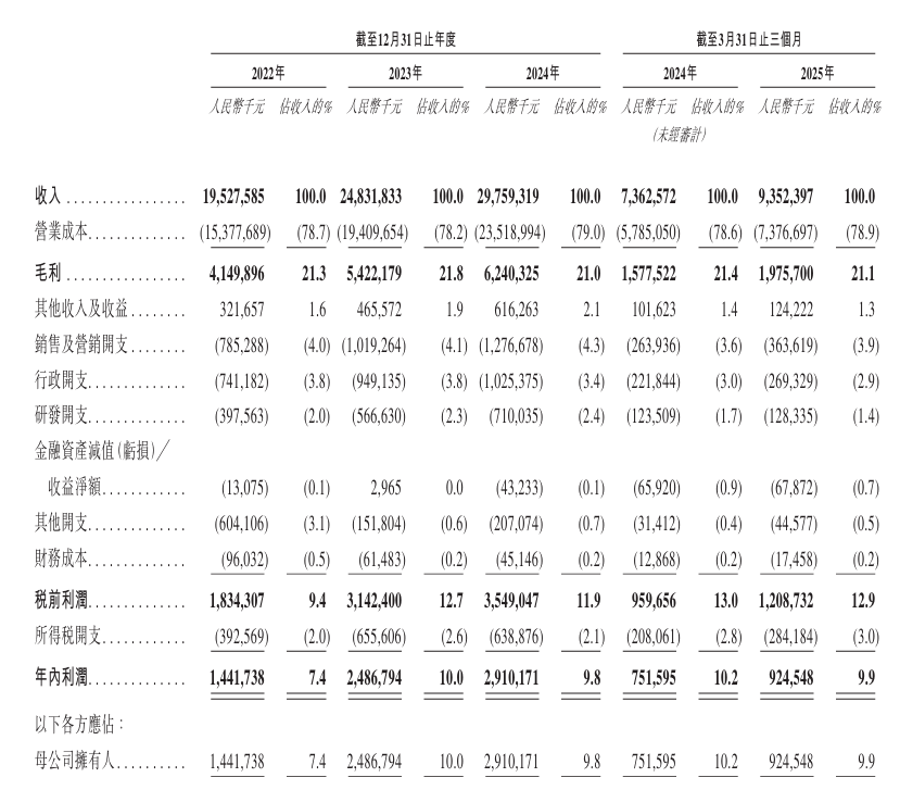 业绩方面,招股书显示,2022年到2024年,其收入分别为195亿元、248亿元、298亿元,三年增长了52.8%;净利润分别为14.4亿元、24.9亿元、29.1亿元,三年增长102%。2025年前三个月,奥克斯的业绩同样保持增长态势,其收入和净利润分别同比增长27%、23%。