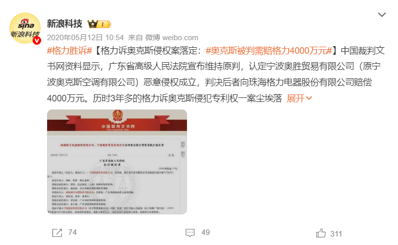2016年到2018年,格力多次因专利侵权起诉奥克斯。其中2018年4月24日,针对格力诉奥克斯的一起专利侵权案,广州知识产权法院一审判决奥克斯赔偿格力经济损失及维权合理费用共4000万元,该赔偿金额在当时创造了家电行业知识产权诉讼赔偿最高纪录。