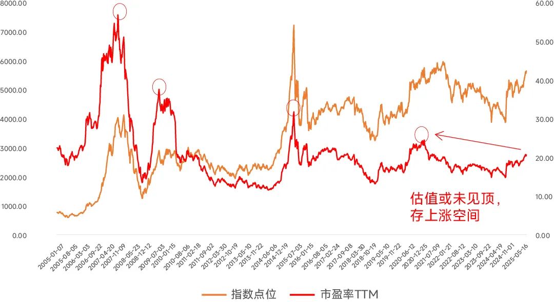 Wind数据显示,2025年7月30日万得全A市盈率(TTM)为20.6倍,离2021年初的24倍还有16%左右的空间,或尚未见顶,估值可能还会走高。