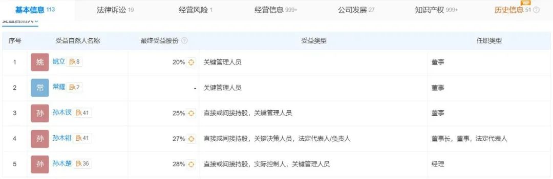 天眼查显示,老三孙木楚,持有28%股权,超过两位哥哥和姚立,为台铃实际控制人。