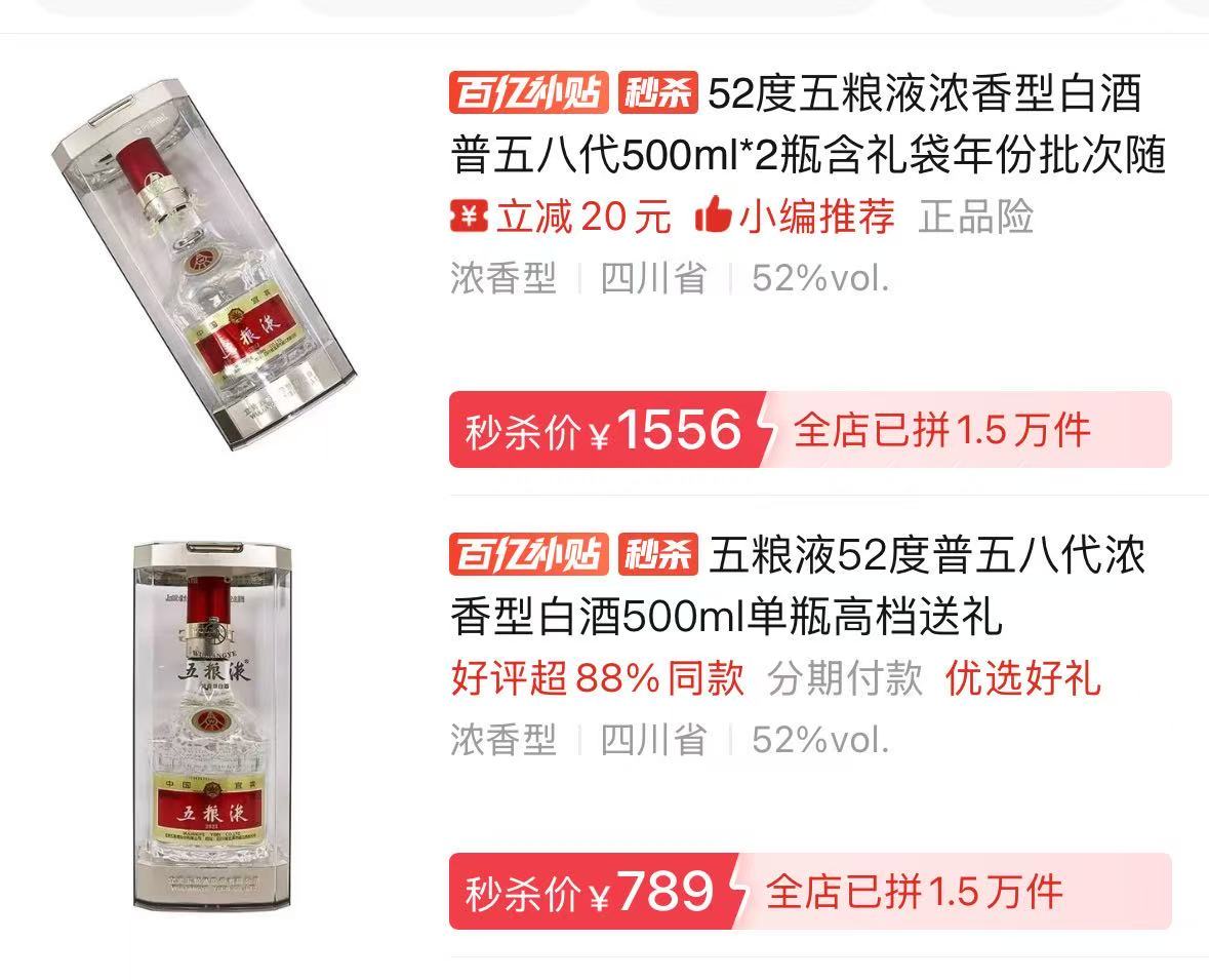 批发参考价“破价”,八代普五在零售市场呢?8月7日,在拼多多,八代普五在一些店铺的售价仅789元/瓶,双瓶装售价报1556元,折合每瓶仅778元,相关店铺均承诺假一赔十;不过,五粮液公布的线上平台中,拼多多及平台店铺均不在列。其他电商平台上,八代普五售价基本都在800元以上;距800元较近的是美团闪购,售价为821元/瓶。值得一提的是,在线下,有商场八代普五的售价945元/瓶,创年内新低。