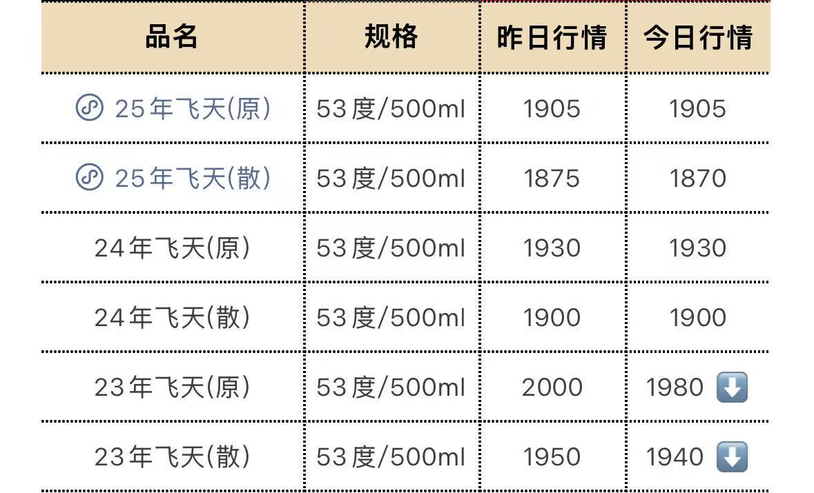 投资快报记者关注到,继此前25年、24年飞天茅台(53度/500ml,下同)散瓶和原箱全线跌破2000元/瓶的“心理防线”,以及23年散瓶“破防”后, 23年原箱价也在8月7日宣告“失守”,当天报1980元/瓶,较前一日下跌20元。而在6月11日率先“破防”的25年散瓶报1870元,较前一日下跌5元,较平台有记录时的2200元/瓶,跌去了15%。