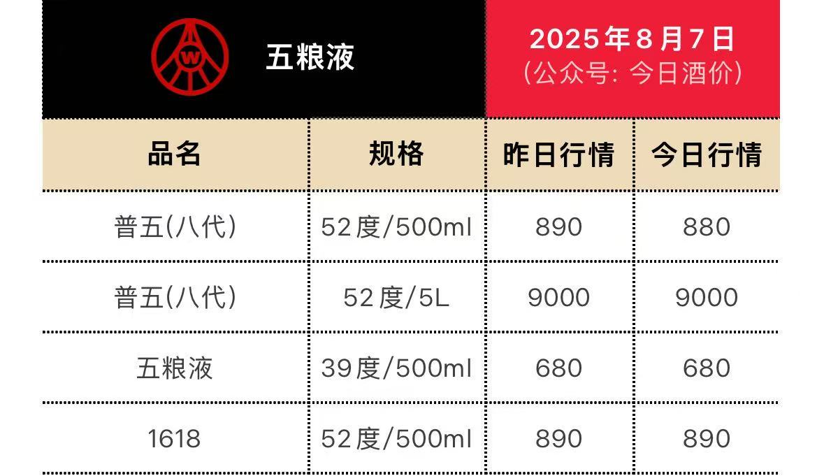 茅台酒全线“破防”后,五粮液等高端白酒受压。酒类行情监测平台“今日酒价”公众号的数据显示,8月7日,八代普五(52度/500ml下同)批发参考价报880元/瓶,较前一日下跌10元,自8月4日“破价”以来,已经连续三天低于900元;据投资快报记者统计,这较年初的950元/瓶跌去了6.32%。