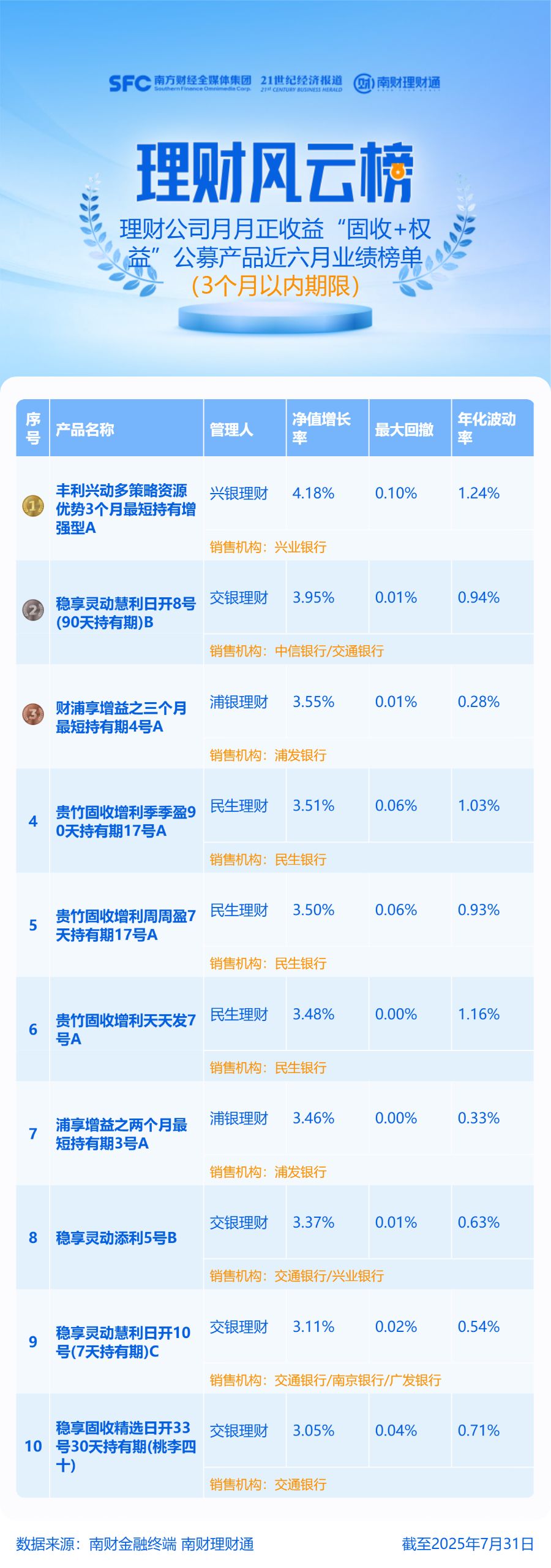 产品统计范围为理财公司3个月以内期限的“固收+权益”理财公募产品,统计截止日期为2025年7月31日,统计区间为近6个月。