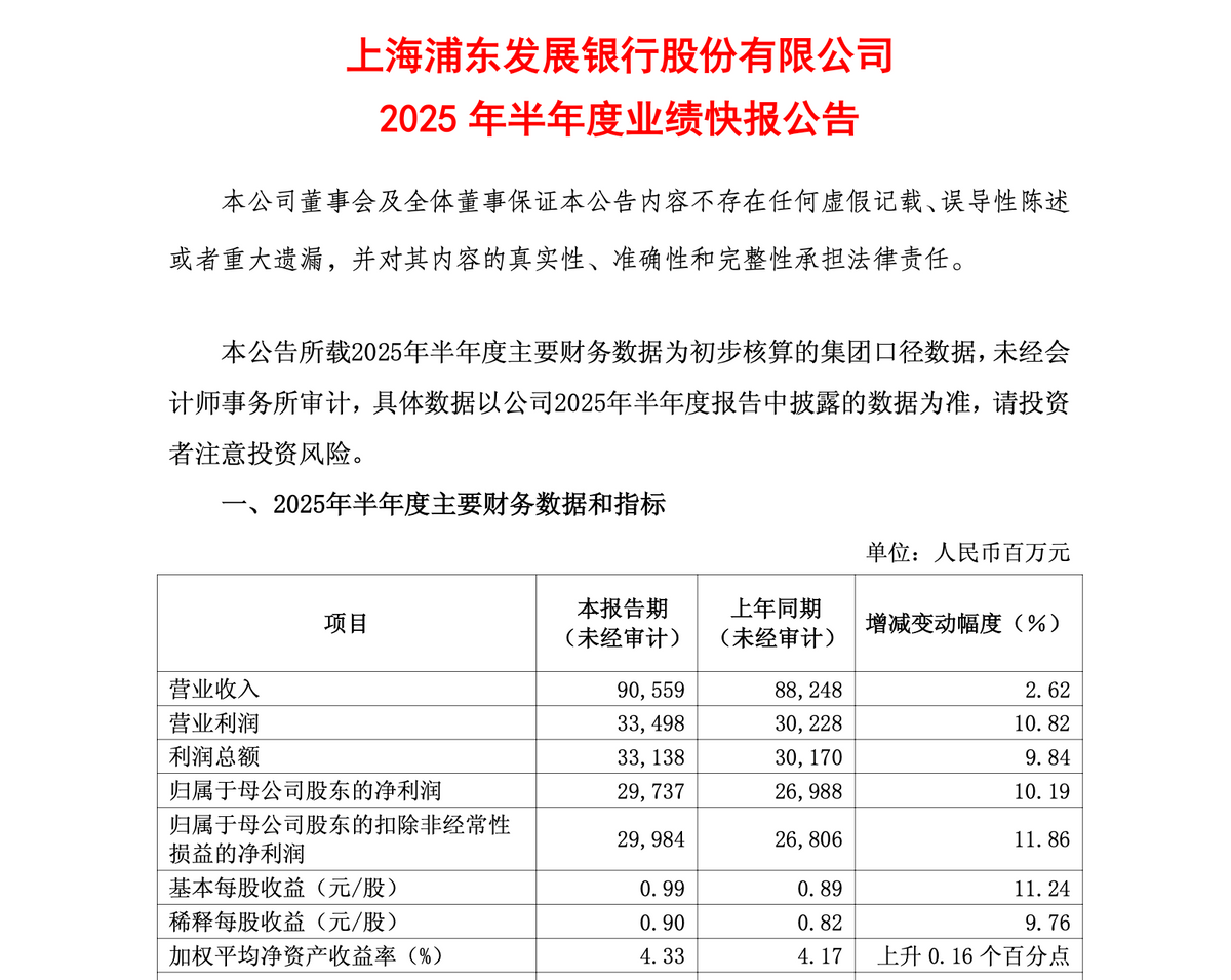 据业绩快报显示,2025年上半年,浦发银行实现营业收入905.59亿元,同比增长2.62%;实现归母净利润297.37亿元,同比增长10.19%。加权平均净资产收益率(ROE)为4.33%。