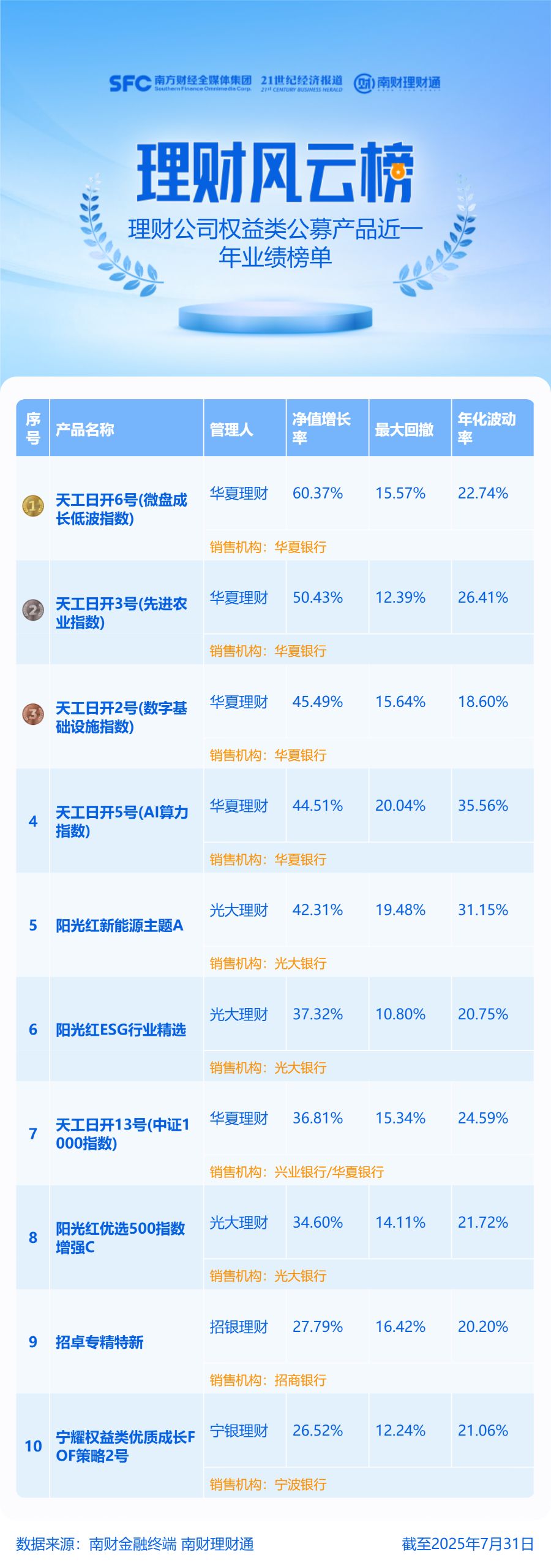 产品统计范围为理财公司权益类理财公募产品,统计截止日期为2025年7月31日,统计区间为近一年。