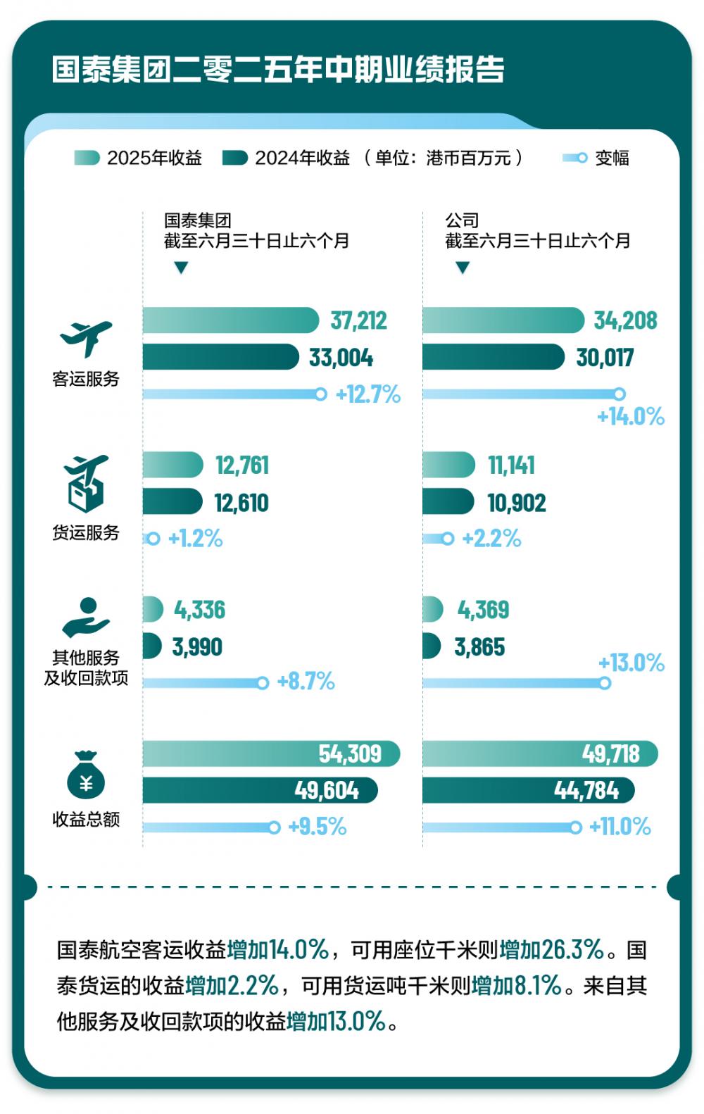8月6日,国泰集团交出了一份稳中有进的成绩单:得益于客运运力及客运量增长,2025年上半年实现营收543.09亿港元,同比增长9.5%;净利润37亿港元,同比增长1.1%。在全球航空业复苏趋缓、地缘政治与关税不确定性叠加的背景下,这份成绩单尤为可贵。