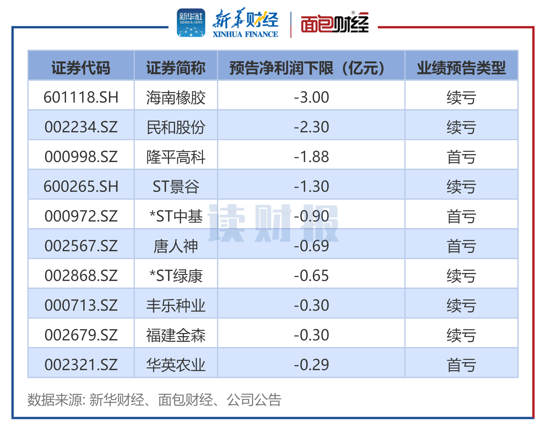 海南橡胶、民和股份预告2025年中报利润下限亏损超过2亿元。此外隆平高科、ST景谷等10余家公司出现亏损。