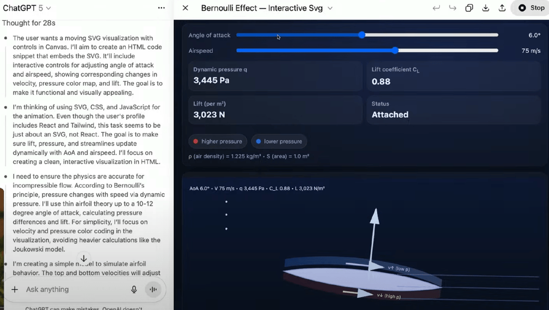 发布会现场,OpenAI通过一些案例具体展示了OpenAI的编程能力,比如让它做一个阐释伯努利效应的网页,在两分钟内,GPT-5跑出了400行代码,做了一个支持调整参数的网页版本。