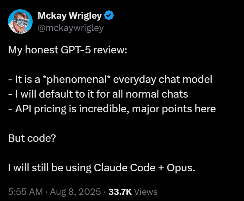 本月,在OpenAI发布两个开源模型的当天,Anthropic早其十几分钟,发布了小更新版本Claude 4.1。特别是在这家公司还预告了“大幅度更新模型”即将在本月发布的情况下,0.4%的微弱差距,很难让人对OpenAI保持乐观。