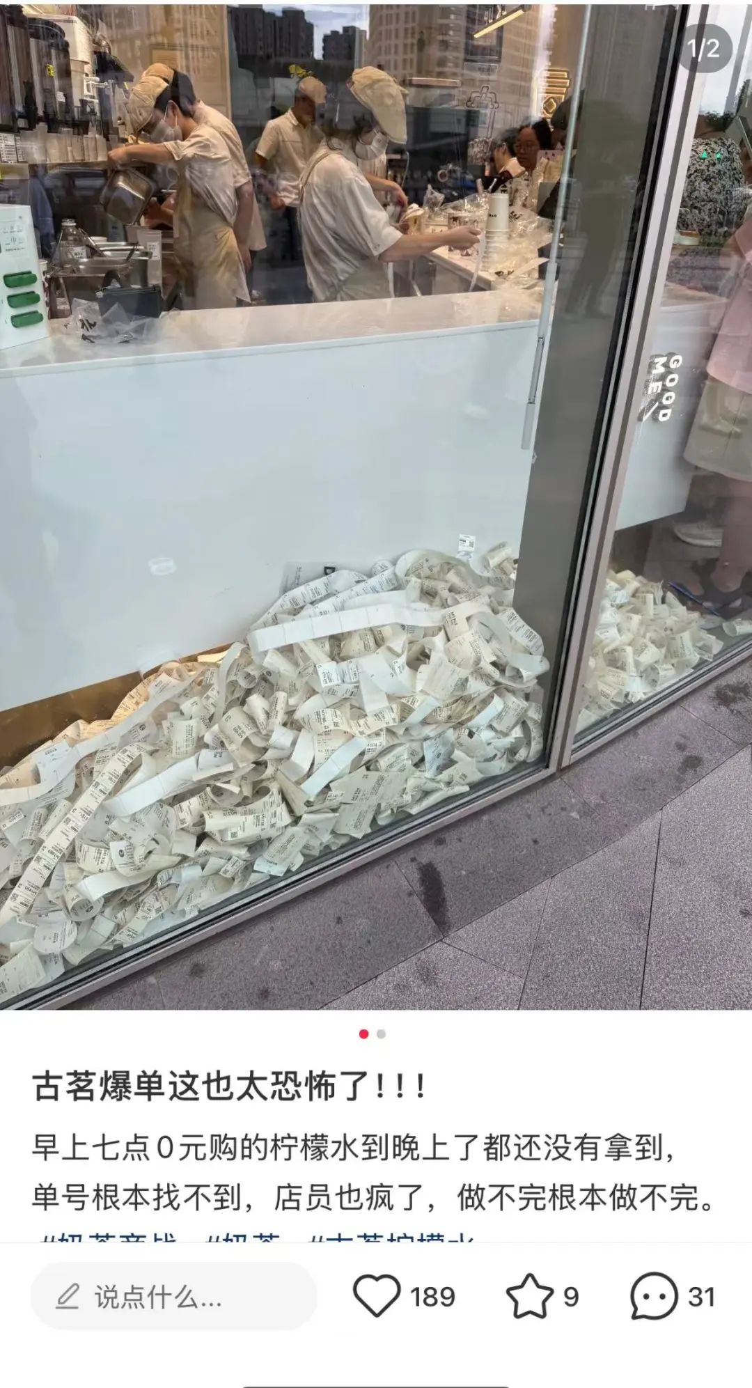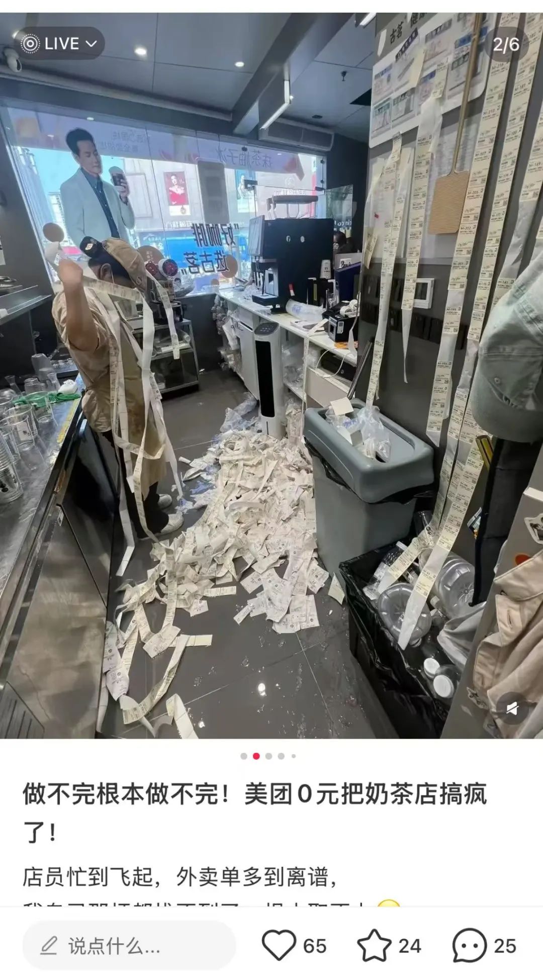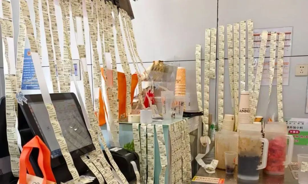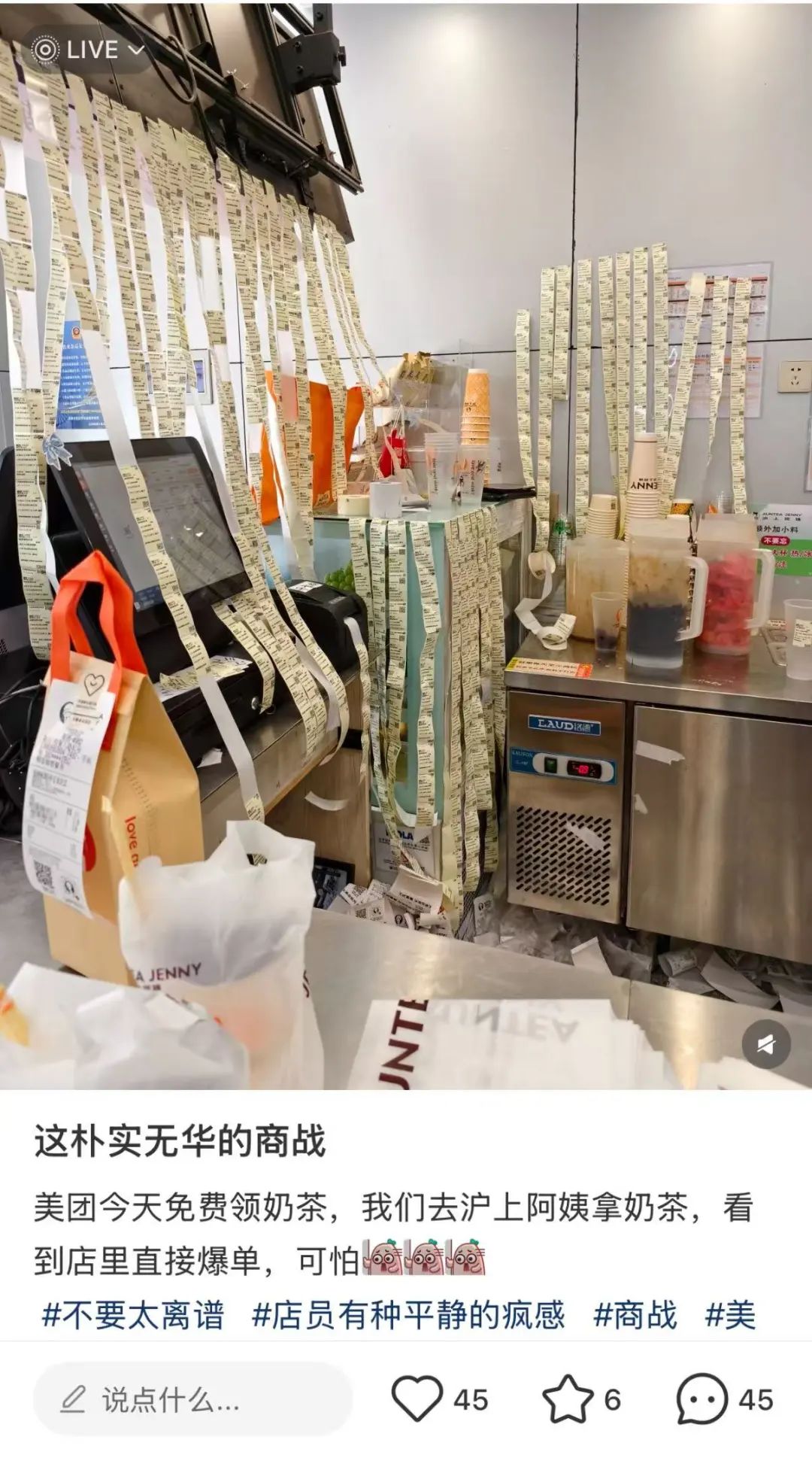 社交平台上,不少网友发布了今天奶茶店爆单的图片,奶茶杯子堆成了小山,订单随意地堆了满地,奶茶店里也挤满了等单的外卖小哥。