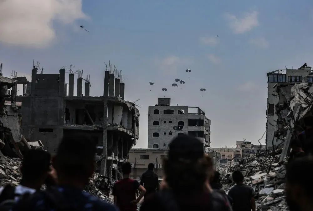 8月8日,飞机在加沙城上空空投物资。新华社发(里泽克·阿卜杜勒贾瓦德 摄)